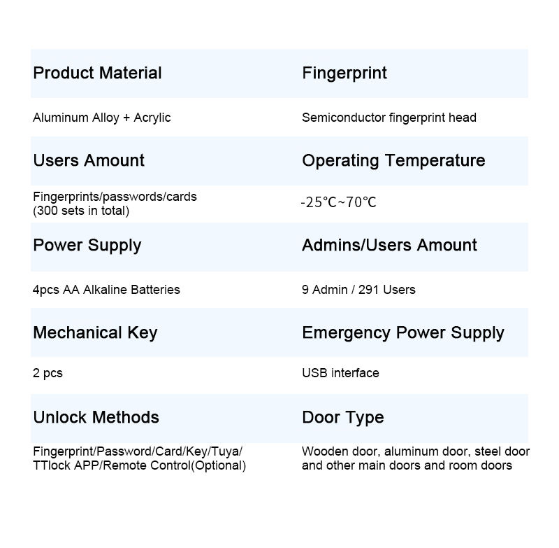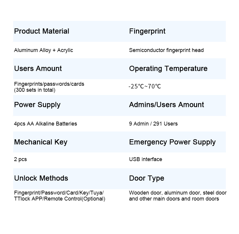 | Löschmethoden | Tuya WiFi/TT Schließ-App, Passwort, Fingerabdruck, Karte, Schlüssel, USB-Anschluss |